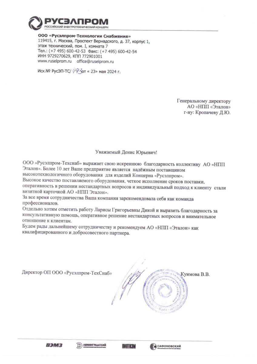 ООО «Русэлпром-Техснаб» выражает свою искреннюю благодарность коллективу АО «НПП Эталон». Более 10 лет Ваше предприятие является надёжным поставщиком высокотехнологичного оборудования для изделий Концерна «Русэлпром».