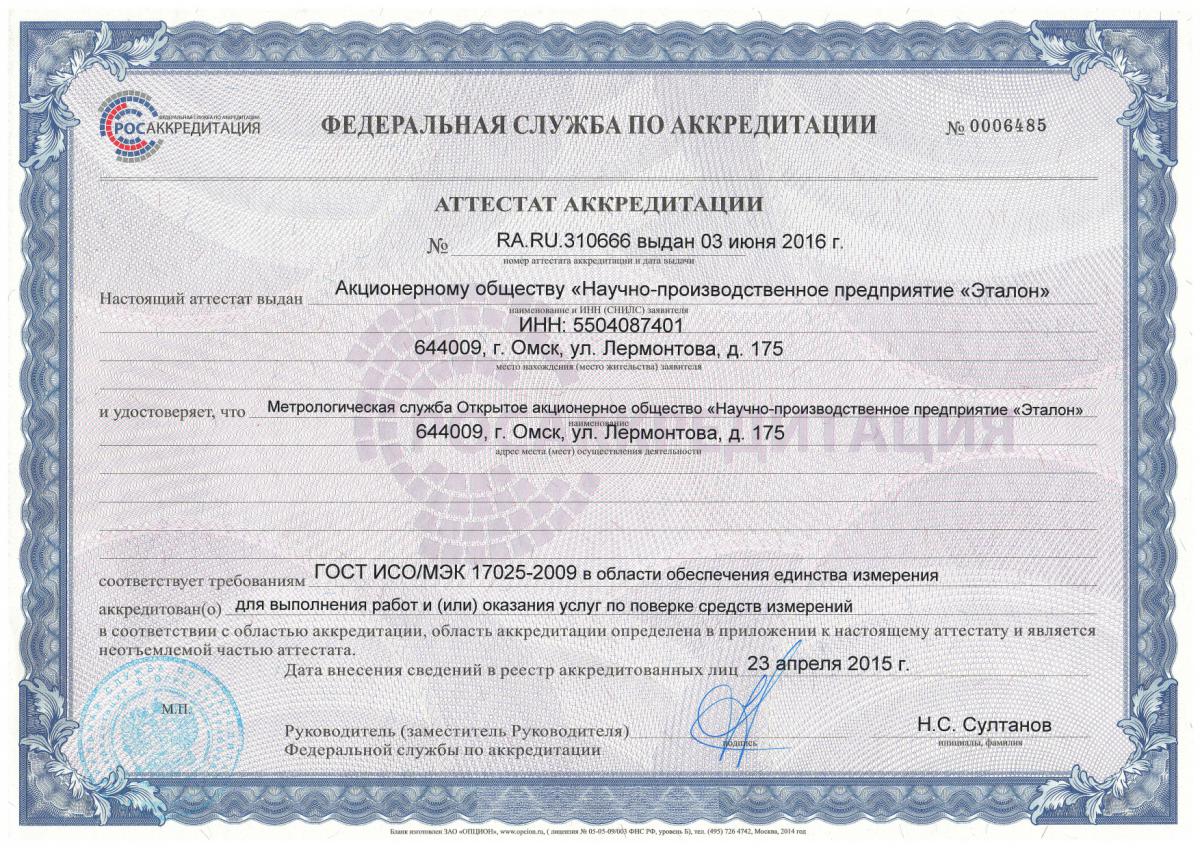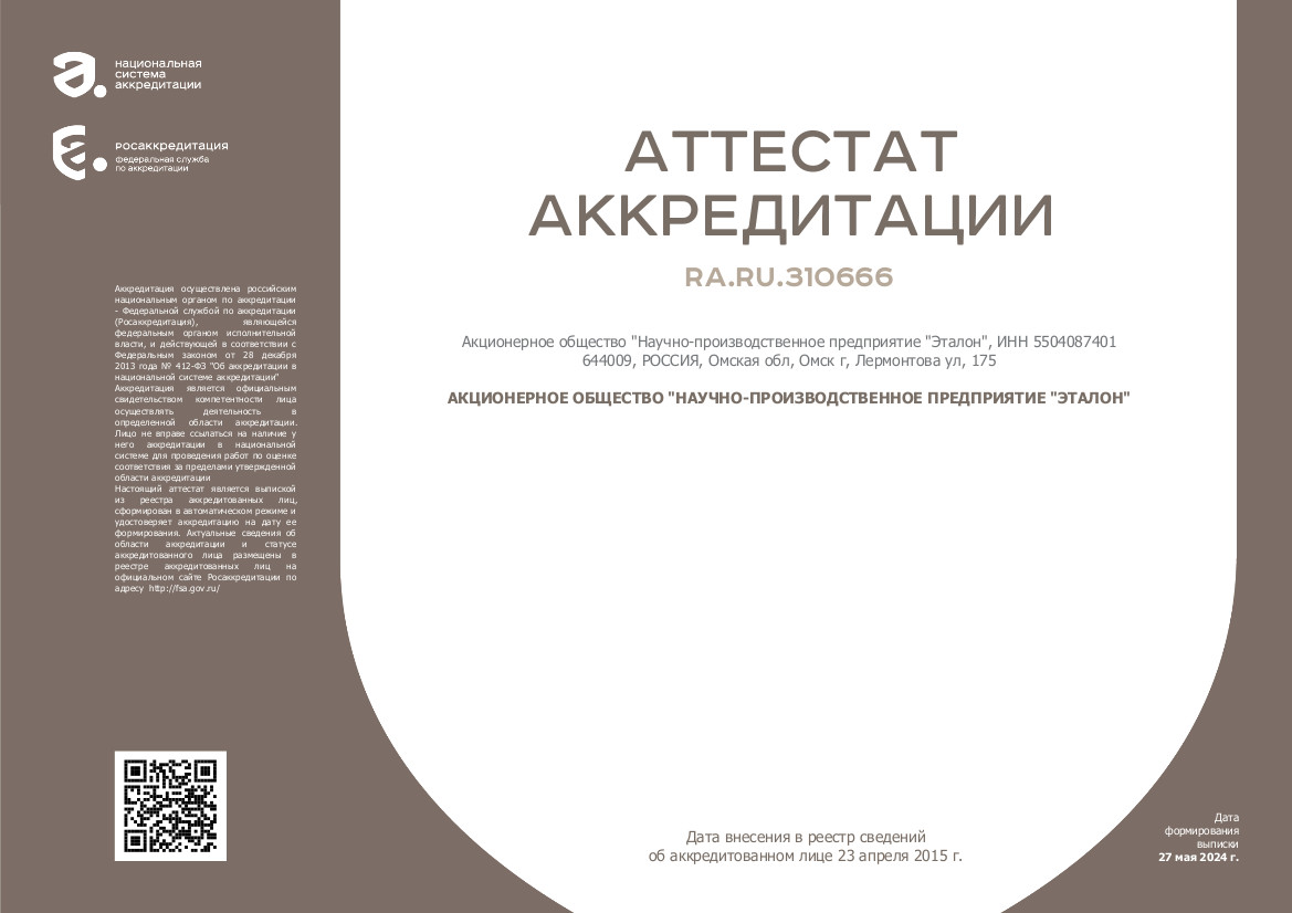 Аттестат аккредитации федеральной службы по аккредитации на осуществление деятельности в области обеспечения единства измерений для выполнения работ и оказания услуг по поверке средств измерений