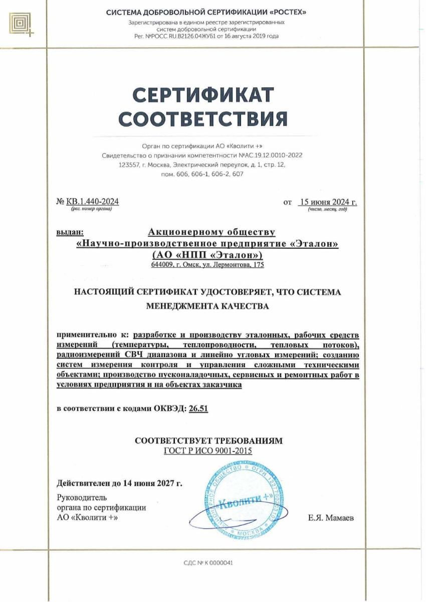 Сертификат соответствия системы менеджмента ISO 9001: 2015