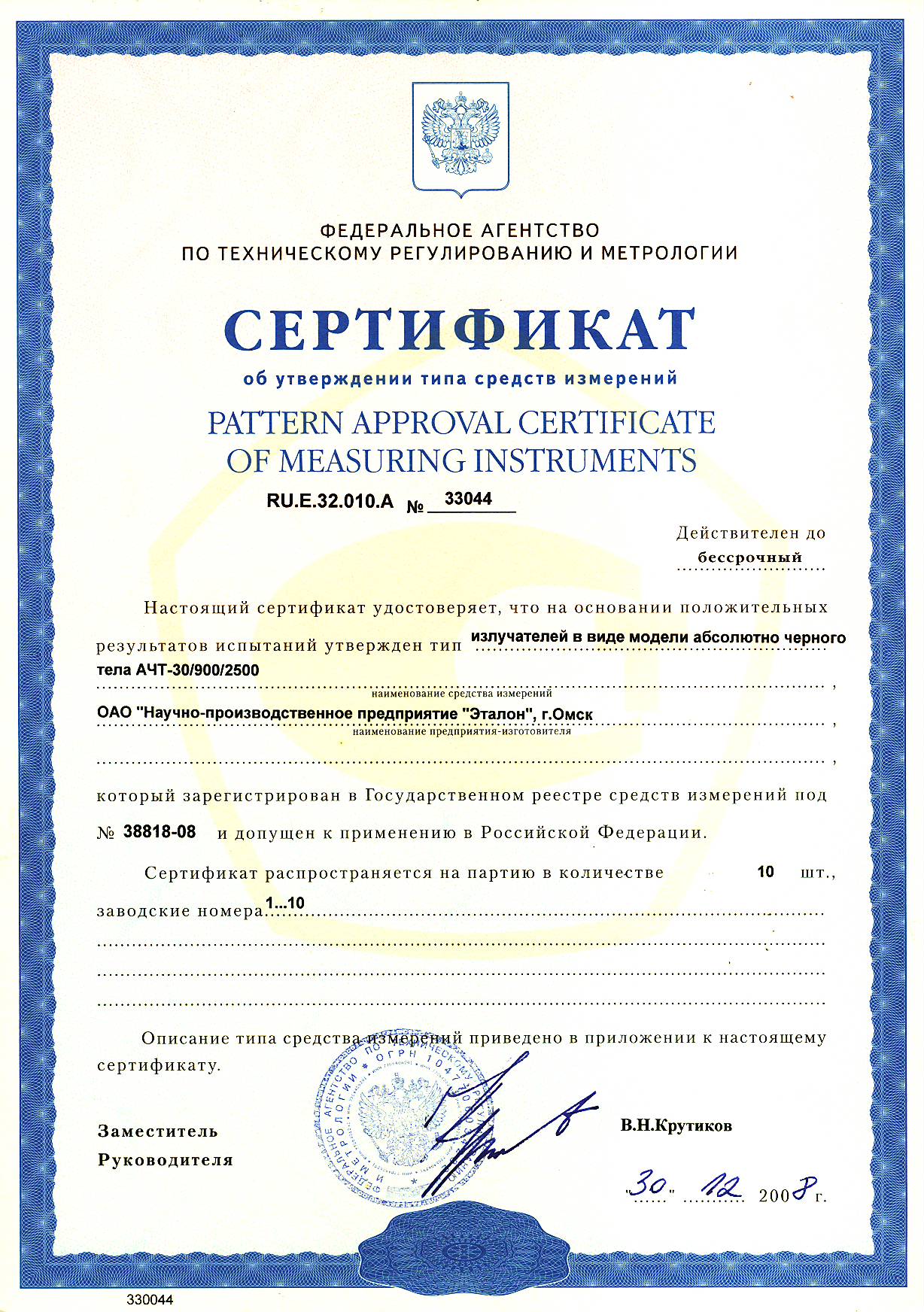 Первый образец излучателя АЧТ-30/900/2500, разработанный по техническому заданию ВНИИМ для использования как средство измерений в составе первичного эталона температуры для бесконтактных средств измерений для диапазона от 900 до 2500°С, был проверен во ВНИИМ на соответствие заявленным характеристикам и использовался для реализации точек фазового перехода (плавления - затвердевания) чистых металлов в составе государственного эталона при проведении сличений среди национальных лабораторий (Франция, Германия и др.) в целях обеспечения единства измерений в соответствии с международной температурной шкалой МТШ-90.