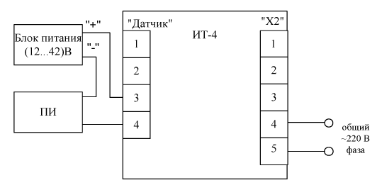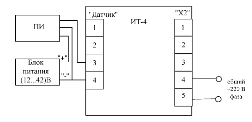 Схема подключения ИТ-4 с ПИ с выходным током Схема подключения ИТ-4 с ПИ с выходным напряжением