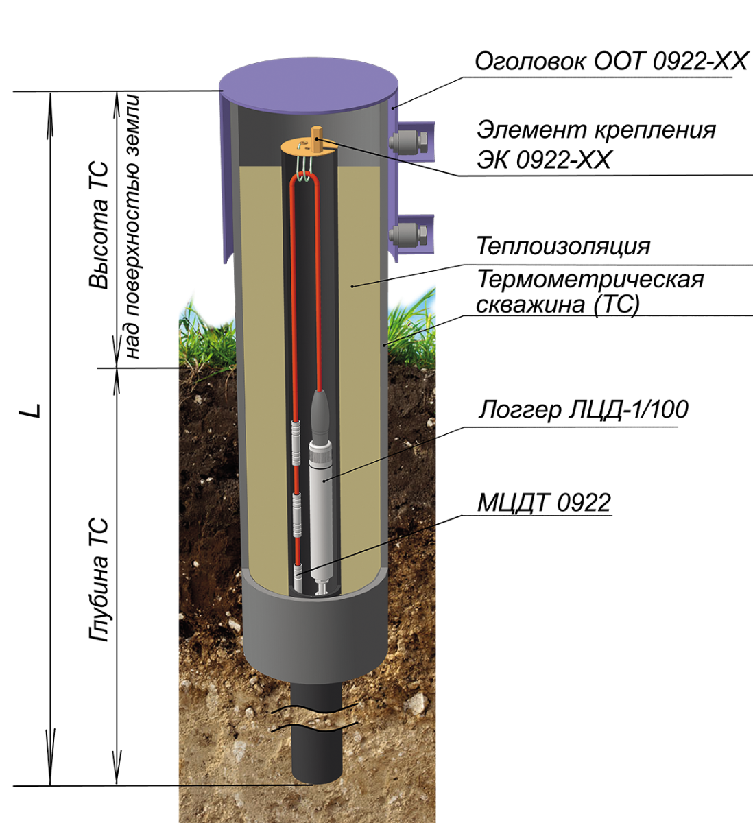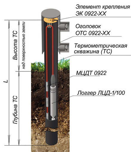 При комплектации и обустройстве термометрической скважины необходимо учесть, чтобы длина соединительного кабеля (расстояние от первого датчика до разъема) термокосы МЦДТ 0922 могла обеспечить расположение логгера ЛЦД на глубине 0,5…2 м от поверхности грунта. Это обеспечит комфортные условия работы для логгера даже при критических отрицательных температурах. Оголовки термометрической скважины ОТС 0922-ХХ и ООТ 0922-ХХ предназначены для защиты скважины от попадания атмосферных осадков и от актов вандализма.