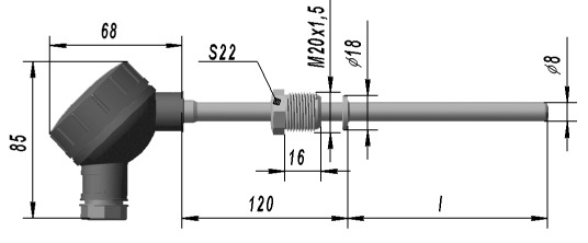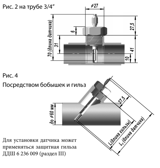 Для установки может применяться защитная гильза ДДШ 6 236 009 для длин датчика 60, 80, 120 , 160, 200 мм.