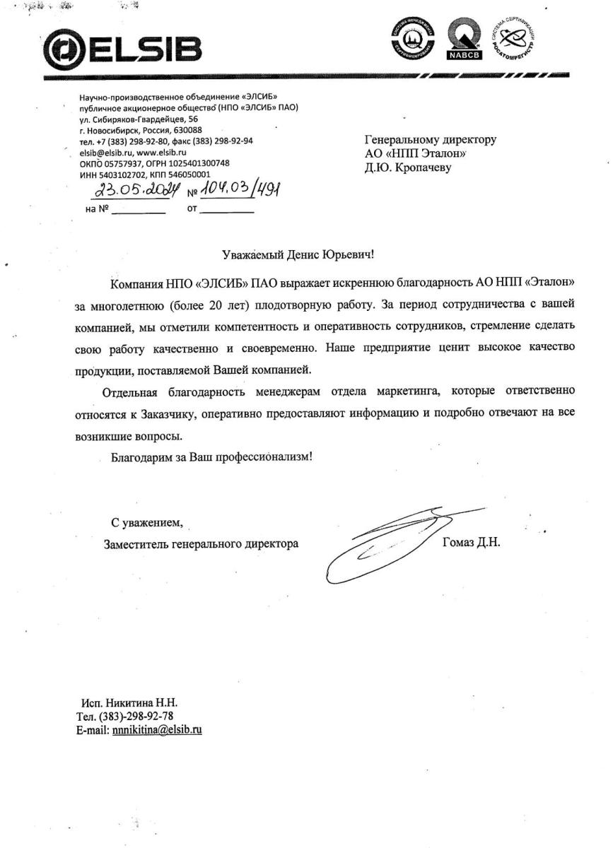 Компания НПО «ЭЛСИБ» ПАО выражает искреннюю благодарность АО НПП «Эталон» за многолетнюю (более 20 лет) плодотворную работу. За период сотрудничества с вашей компанией, мы отметили компетентность и оперативность сотрудников, стремление сделать свою работу качественно и своевременно. Наше предприятие ценит высокое качество продукции, поставляемой Вашей компанией.