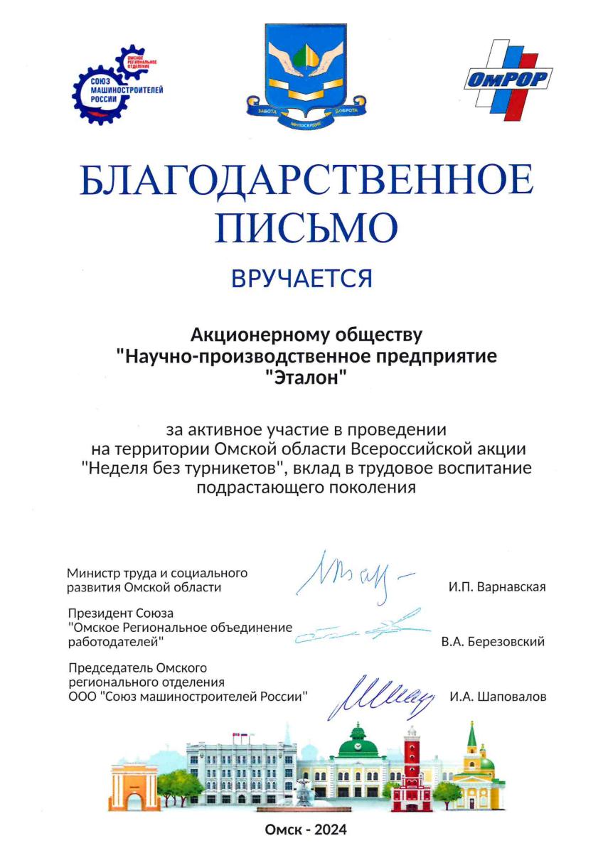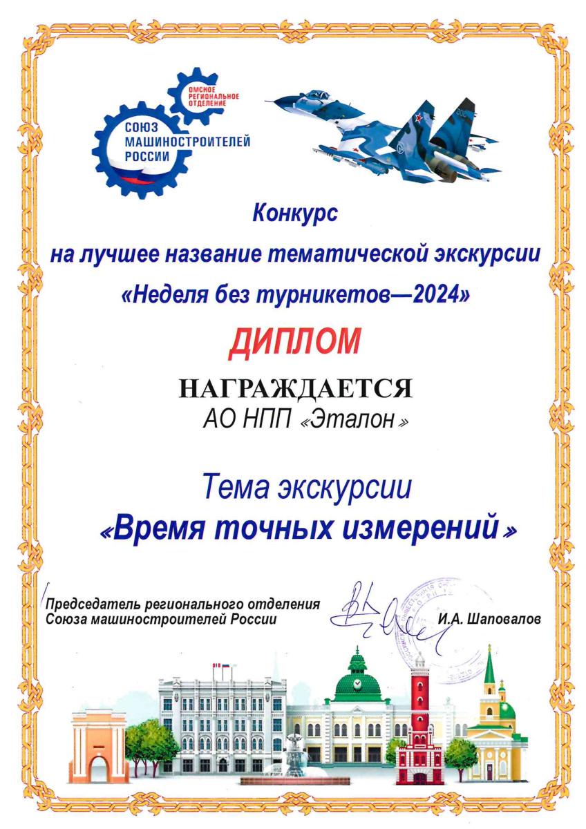 4 декабря АО «Научно-производственное предприятие «Эталон» было награждено Благодарственным письмом Оргкомитета и Благодарственным письмом Омского регионального отделения Союза машиностроителей России за активное участие в организации и проведении этой важной акции в 2024 году. Также компания была удостоена Диплома за лучшее название тематической экскурсии «Неделя без турникетов — 2024» на тему «Время точных измерений».