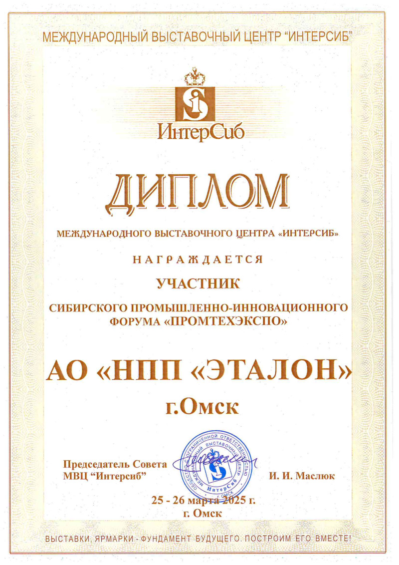 АО «НПП «Эталон» приняло участие в Сибирским промышленно-инновационным форуме «Промтехэкспо-2025» и награждено дипломом участика форума.