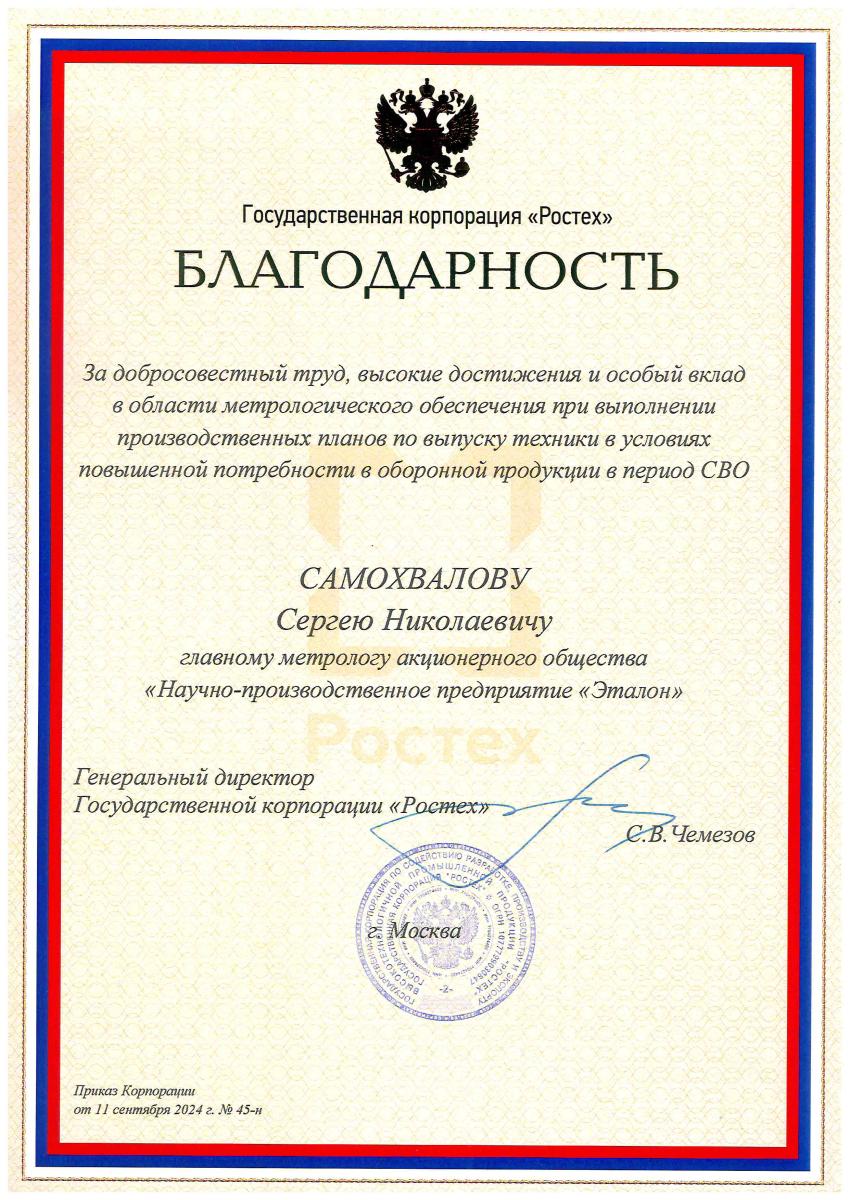 На конференции Госкорпорации Ростех «Метрология — основа качества» вручена Благодарность от ген.директора ГК «Ростех» С.В.Чемизова главному метрологу АО «НПП «Эталон» Самохвалову Сергею Николаевичу за добросовестный труд, высокие достижения и особый вклад в области метрологического обеспечения при выполнении производственных планов по выпуску техники в условиях повышенной потребности в оборонной продукции в период СВО.