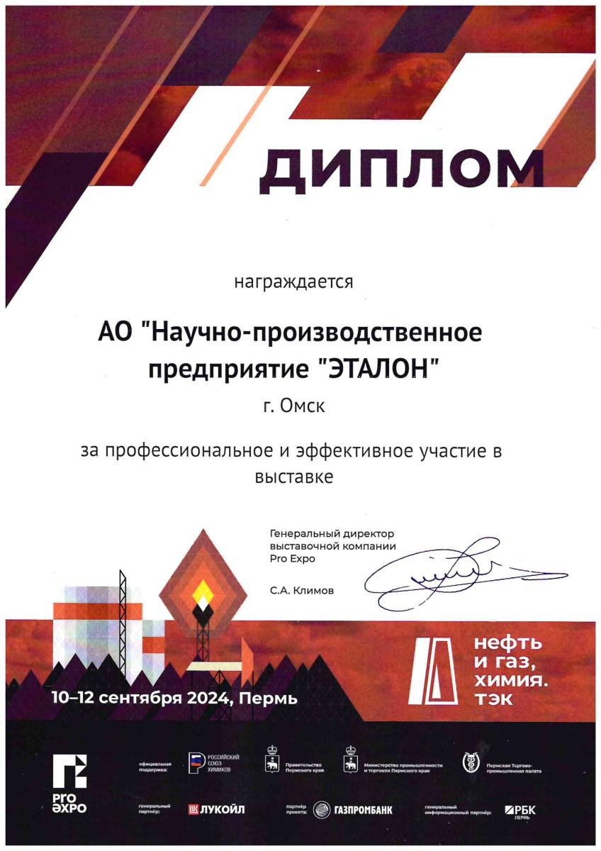 АО «НПП «Эталон» приняло участие в 26-ой межрегиональной выставке-форуме технологий и оборудования для нефтяной, газовой, химической промышленности и топливно-энергетического комплекса «НЕФТЬ И ГАЗ, ХИМИЯ. ТЭК-2024» и было награждено Дипломом за профессиональное и эффективное участие в выставке.