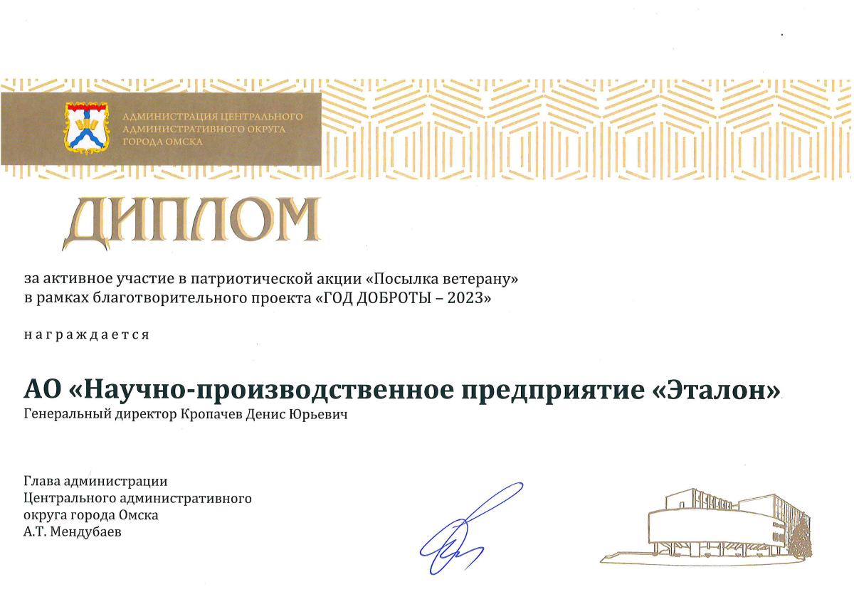 АО «НПП «Эталон» награждено дипломом за активное участие в патриотической акции «Посылка ветерану» в рамках благотворительного проекта «ГОД ДОБРОТЫ - 2023»