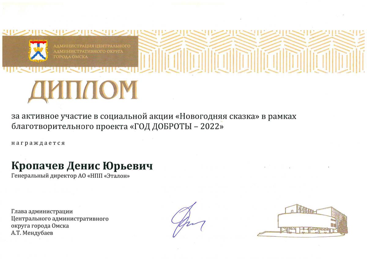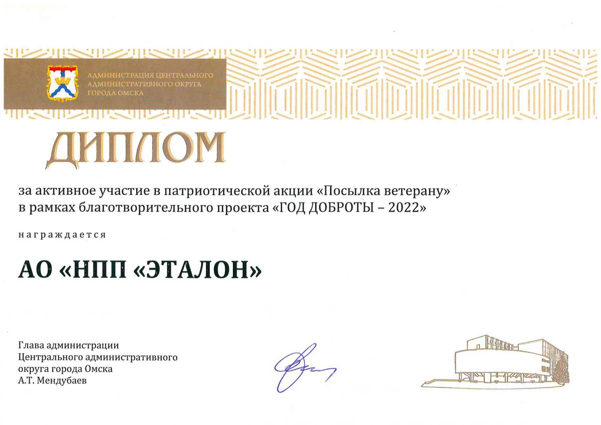 АО «НПП «Эталон» награждено дипломом за активное участие в патриотической акции «Посылка ветерану», а генеральный директор АО «НПП «Эталон» Кропачев Денис Юрьевич награжден дипломом за активное участие в социальной акции «Новогодняя сказка», в рамках которой была оказана помощь детям, оставшимся без попечения родителей, и детям из социально незащищенных семей.