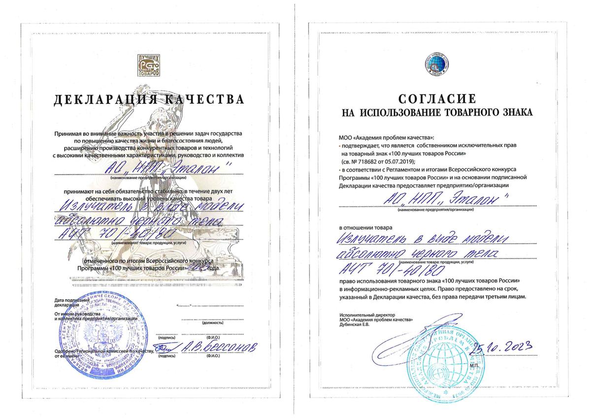 Излучатель в виде модели абсолютно черного тела АЧТ 70/-40/80 признан лауреатом всероссийского конкурса программы "100 лучших товаров России"! Наш излучатель еще раз доказывает высокие и стабильные показатели качества.