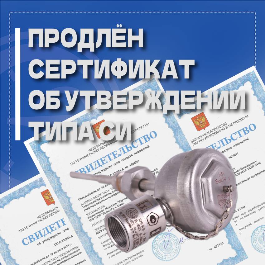 АО «НПП «Эталон» с радостью информирует о продлении сертификата об утверждении типа средств измерений на взрывозащищенные термопреобразователи с унифицированным выходным сигналом ТСПУ 9418 и ТСМУ 9418.