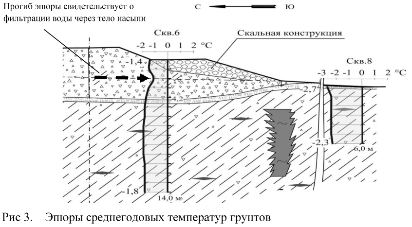 Прогиб эпюры среднегодовых температур грунтов в скважине № 6 на глубине 3 м говорит о фильтрации воды через тело насыпи небольшой интенсивности.