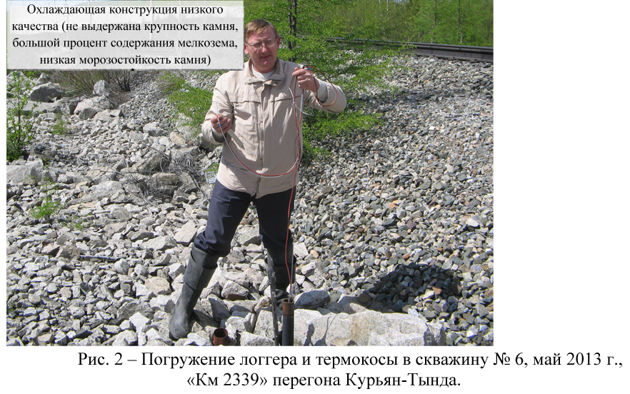 В октябре 2012 г. в две скважины установлены логгеры ЛЦД-1/100-СД и термокосы МЦДТ 0922. Скважина № 6 расположена на правой бровке насыпи со скальной конструкцией на откосе, скважина № 9 находится в полевых ненарушенных условиях. Периодичность измерений температур логгерами – четыре раза в сутки.