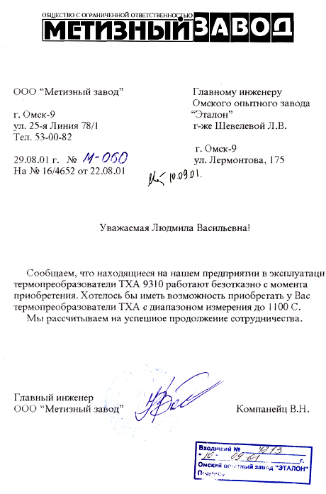 Сообщаем, что находящиеся на нашем предприятии в эксплуатации термопреобразователи ТХА 9310 работают безотказно с момента приобретения. Хотелось бы иметь возможность измерения до 1100 оС.