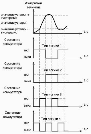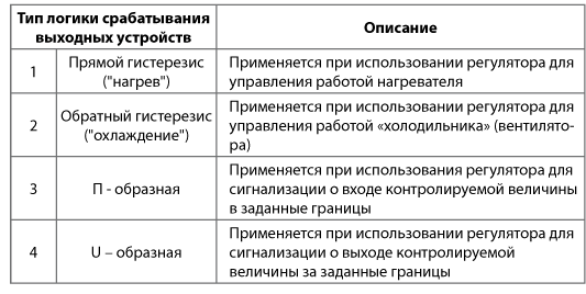 Помимо законов регулирования регуляторы имеют различный тип логики срабатывания выходных устройств (см. рисунок и таблицу).