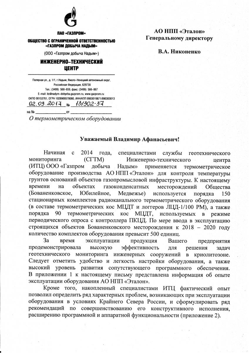 Начиная с 2014 года, специалистами службы геотехнического мониторинга (СГТМ) Инженерно-технического центра (ИТЦ) ООО «Газпром добыча Надым» применяется термометрическое оборудование производства АО НПП «Эталон» для контроля температуры грунтов оснований объектов газопромысловой инфраструктуры. К настоящему времени на объектах газоконденстатных месторождений Общества(Бованенковское, Юбилейное, Медвежье) используется порядка 150 стационарных комплектов радиоканального термометрического оборудования (в составе термометрических кос МЦДТ и логгеров ЛДЦ-1/100 РМ), а также порядка 90 термометрических кос МЦДТ, используемых в режиме периодического опроса с контроллера ПКЦД. По мере ввода в эксплуатацию строящихся объектов Бованенкоского месторождения к 2018-2020 году количество комплектов оборудования превысит 500 единиц.