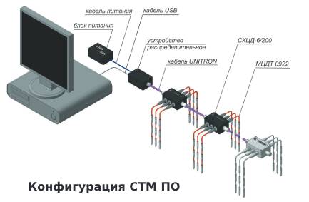 К каждому контроллеру можно подключить от одной до шести термокос, содержащих суммарно до 200 датчиков. Конфигурация возможной реализации системы СТМ ПО приведена на рисунке.