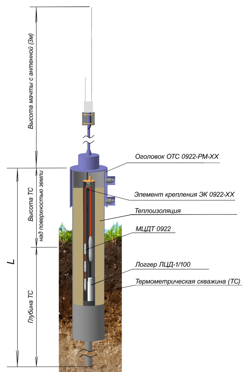 Отличается от второго тем, что вместо логгера с SD картой устанавливается антенна и радиологгер ЛДЦ-1/100-РМ, позволяющий без вскрытия скважины считывать накопленные данные на расстоянии от 1 км. до термометрической скважины.