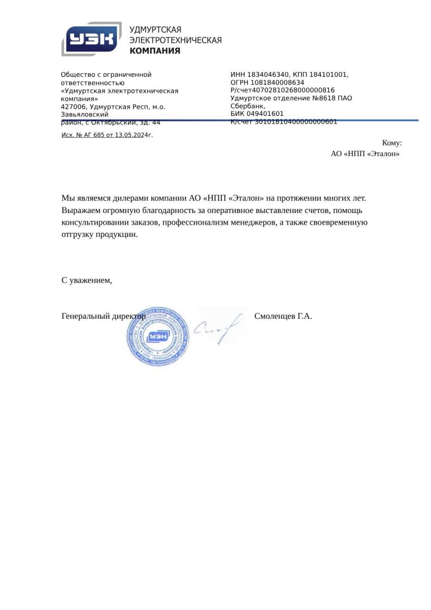 Мы являемся дилерами компании АО «НПП «Эталон» на протяжении многих лет. Выражаем огромную благодарность за оперативное выставление счетов, помощь консультировании заказов, профессионализм менеджеров, а также своевременную отгрузку продукции.